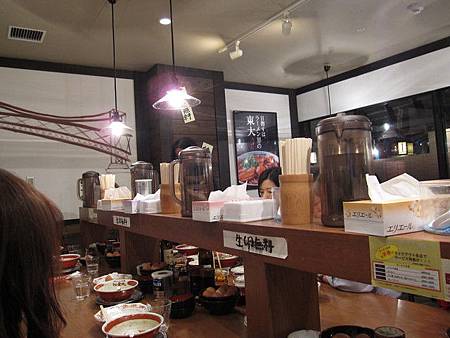 跟對面的客人隔著調味料、水跟筷子等對坐,